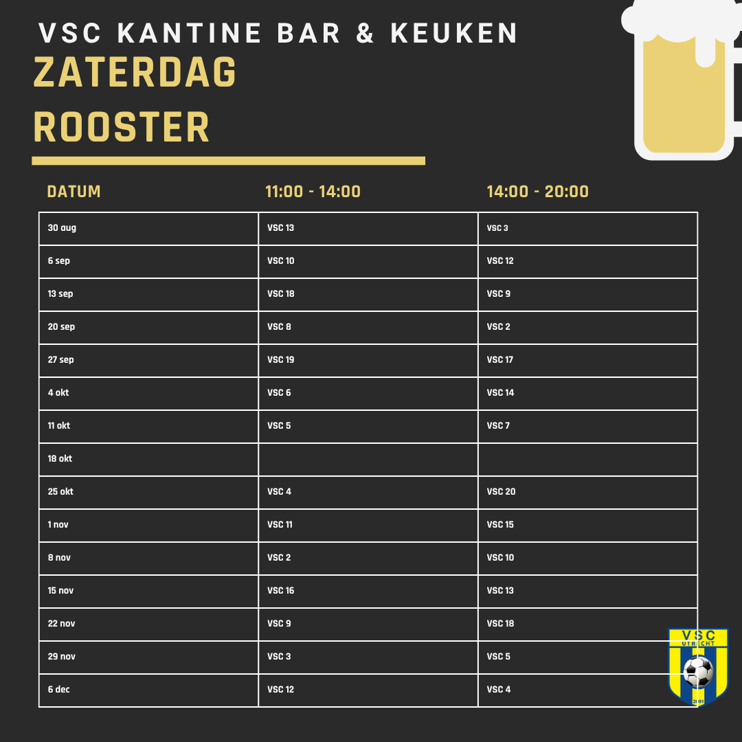 Let op: de kantine van VSC gaat op wedstrijddagen één uur voor aanvang van de eerste wedstrijd open. Bovenstaande tijden zijn de meest gehanteerde openingstijden tijdens het voetbalseizoen. Tijdens de zomer is de kantine alleen in het weekeinde geopend. Op zowel de zaterdag als de zondag kun je dan bij VSC terecht voor een drankje, een kletspraatje of het leggen van een kaartje. Daarnaast worden er voldoende activiteiten georganiseerd, of komt er soms een zanger langs. De kantine is in de zomer in het weekend geopend van 12.00-18.00 uur.